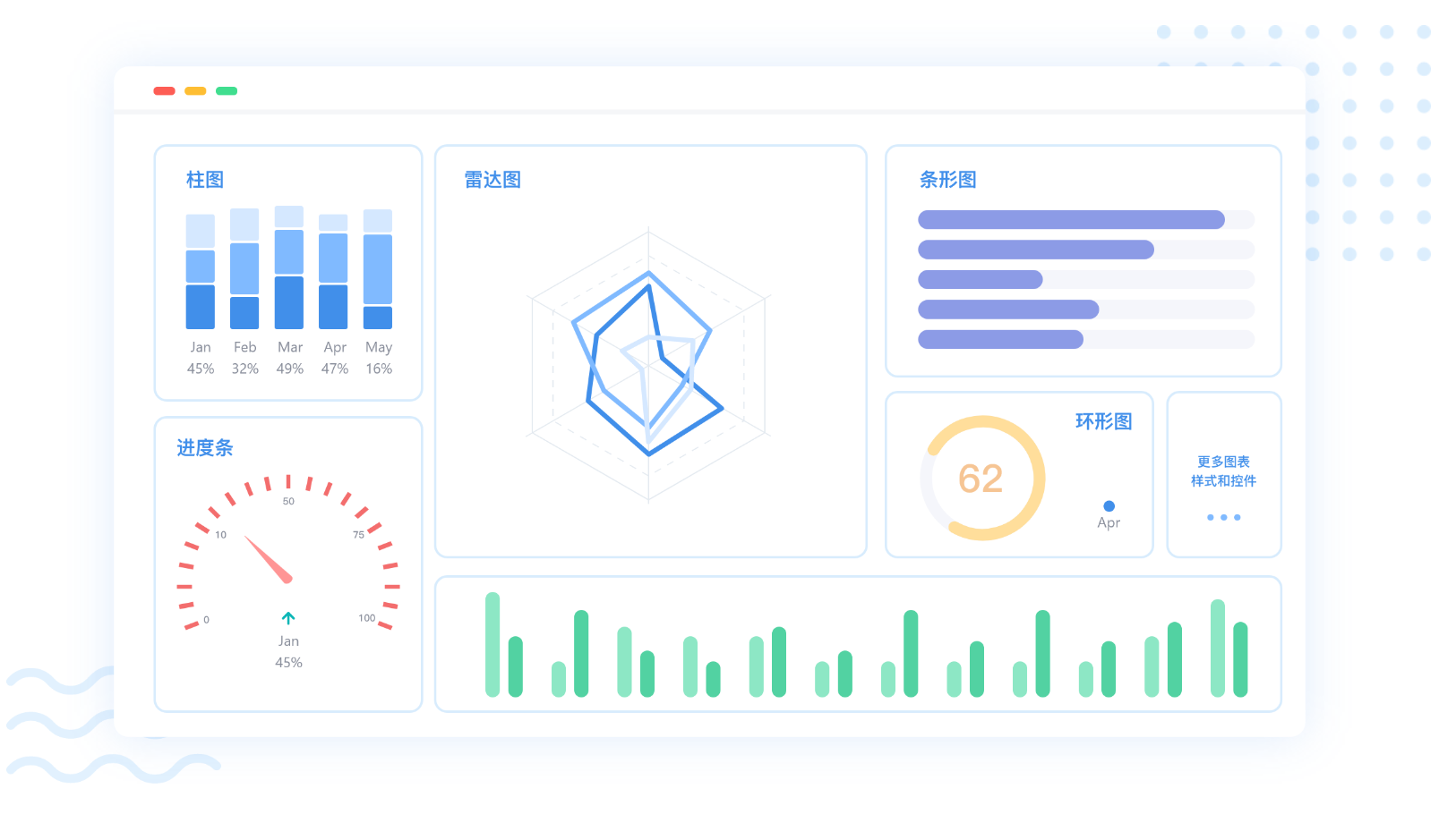 产品内置几十种可视化图表控件,以及外链、图片、文本等卡片类型控件,用户可以根据需求自由定义想要的图表样式属性与风格
