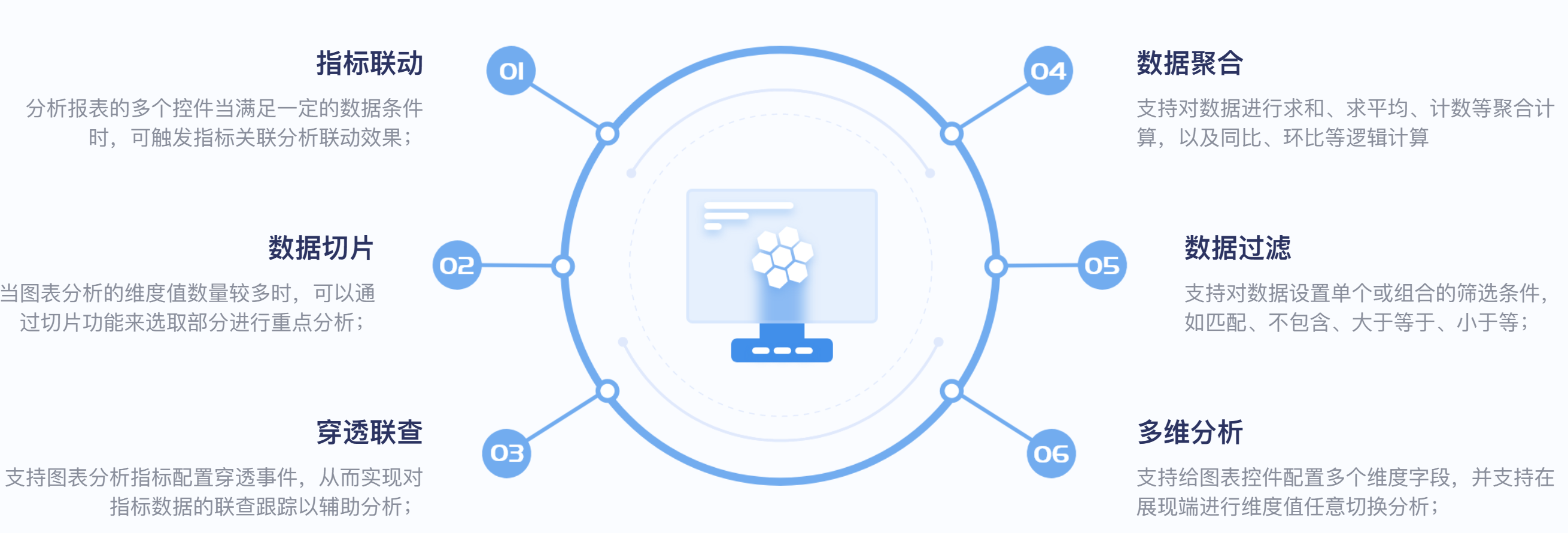 产品支持聚合、自定义计算、过滤等数据处理逻辑,同时支持对展现数据的多维分析、穿透联查、数据切片、指标联动等操作