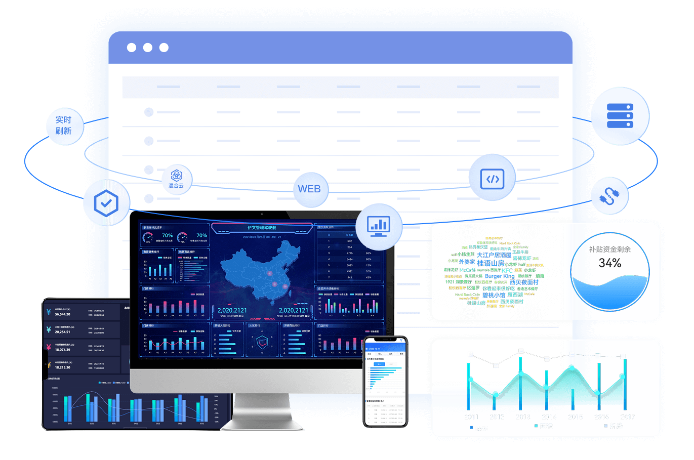 是一款采用原生JS引擎的数据分析与可视化产品,它让不懂代码的人员可以通过拖拉拽操作,快速构建包含丰富图表及酷炫动效的分析仪表盘和大屏看板,且支持多终端设备(电脑、手机、智能电视、LED拼屏等)展现并自适应各种屏幕。产品内置丰富的图表控件及强大的交互功能,如联动钻取、切片、穿透等,助力用户轻松实现数据的自助探索和挖掘分析。