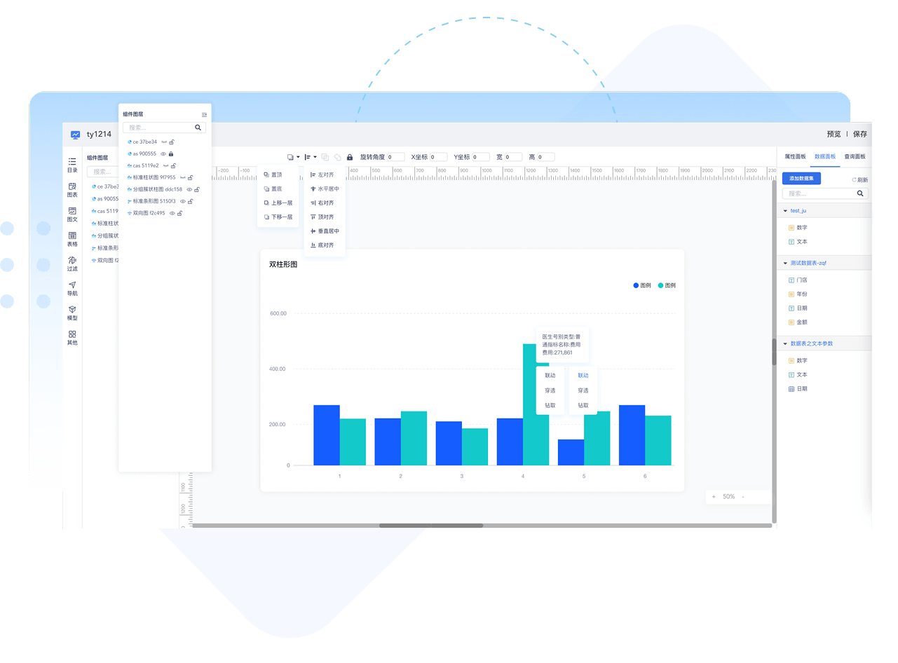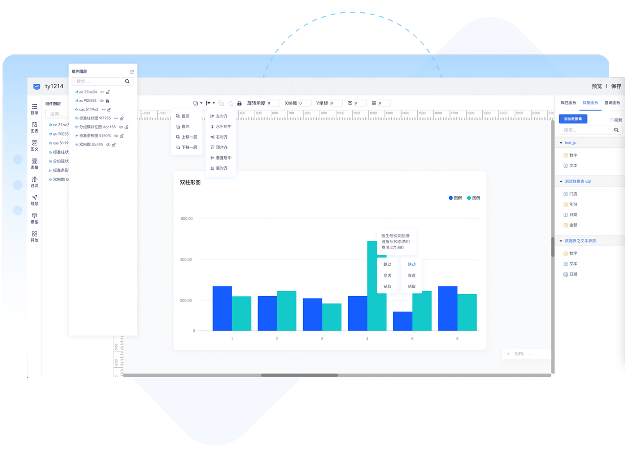 仪表盘还提供了图层管理功能,可以方便地对画布中的各种元素进行分组、打散、锁定、位置调整等操作,并支持同时选中多个元素进行批量快捷操作,让您可以轻松高效的管理画布中的内容。