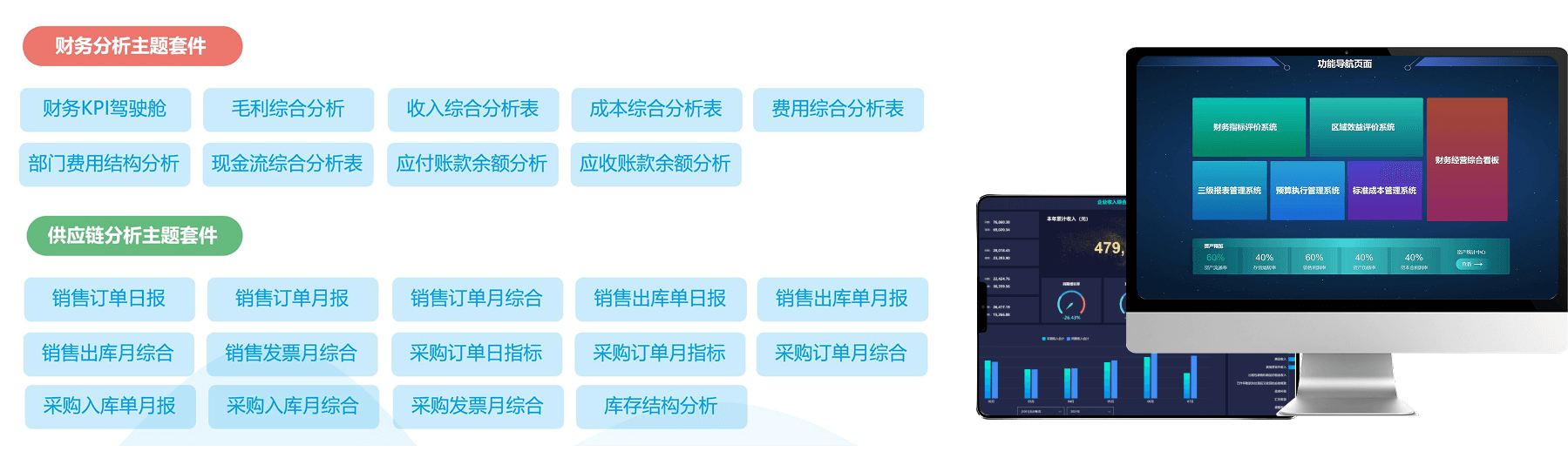 财务分析主题报表、销售分析主题报表、采购分析主题报表、库存分析主题报表、生产分析主题报表、人力分析主题报表、客户分析主题报表等。 一次封装,长期受用;简单配置,开箱即用;新客签约,打单利器;老客挖掘,批量增值。