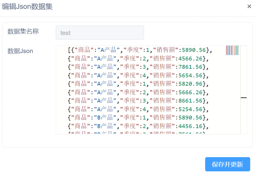 在数据面板中添加数据集,可选择Json数据集和Http接口数据集,Json数据如下图所示: