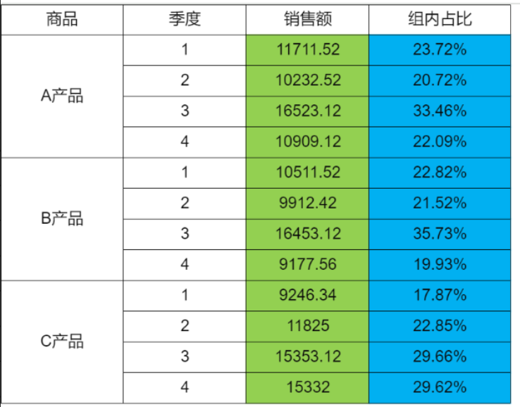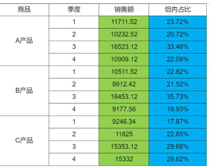如下图所示,计算不同商品中每个季度销售额在总销售额的占比。