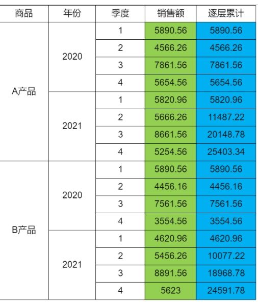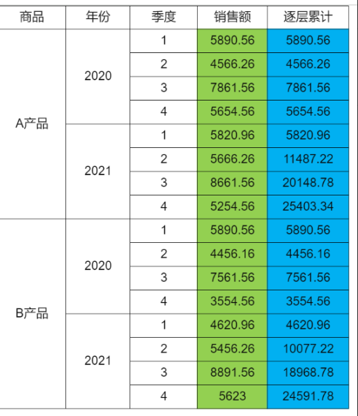 逐层累计:每组中分别将每层与上一层数据相加,得到本层的累计结果,并按照年份隔断,达到分组累加的效果。