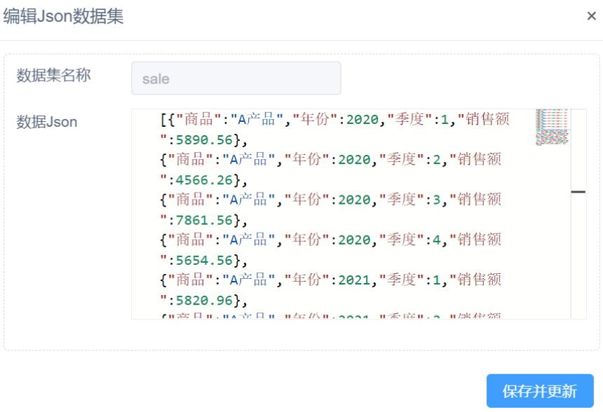 在数据面板中添加数据集,可选择Json数据集和Http接口数据集,Json数据如下图所示: