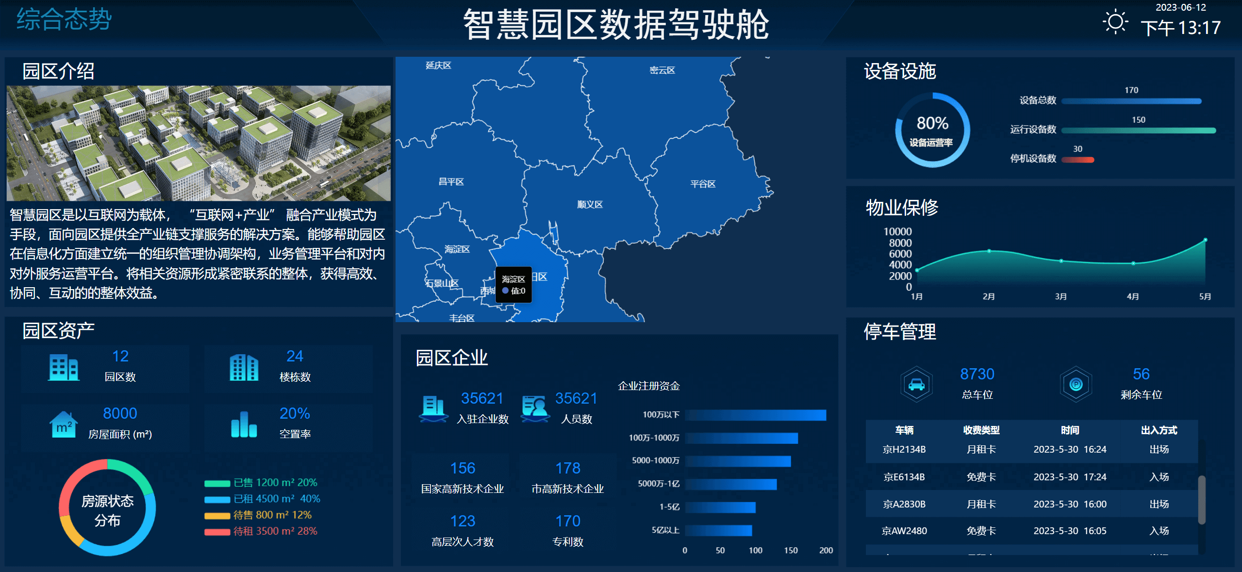 1.实时监控和管理:数据大屏可以实时监控和管理园区内各个系统和设备的运行状态,及时发现问题并进行处理,保证园区的安全和生产效率。