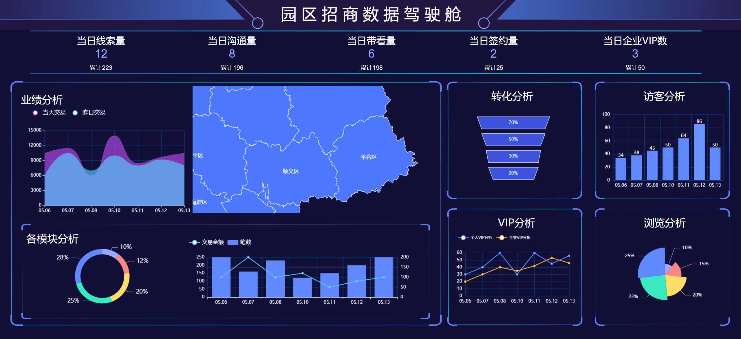 4.决策支持:数据大屏可以为管理人员提供决策支持,通过分析数据,发现潜在问题和机遇,制定更加科学合理的决策方案,促进园区的可持续发展。 提高用户体验:数据大屏可以提供更加直观、便捷的用户体验,用户可以通过大屏查看实时数据、了解园区运行情况和服务信息,提高园区的服务质量和用户满意度。